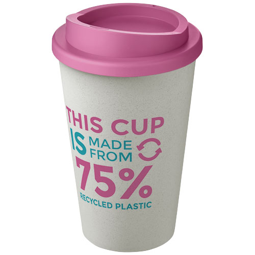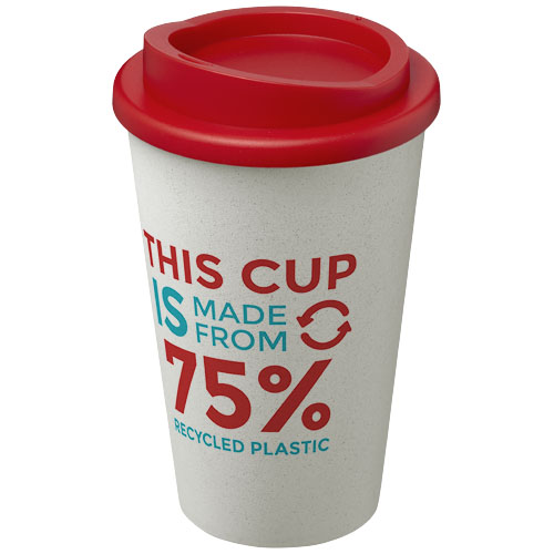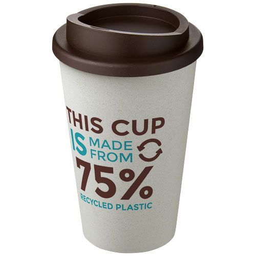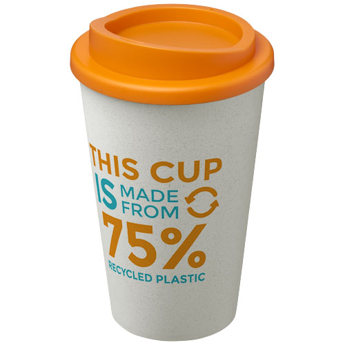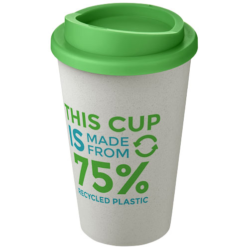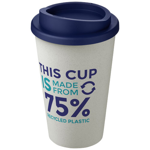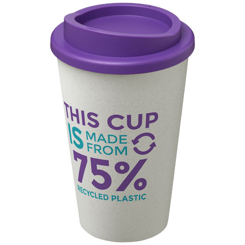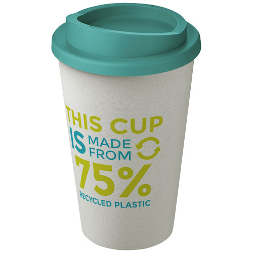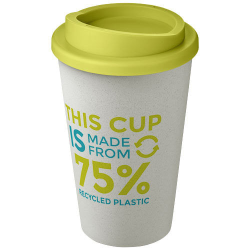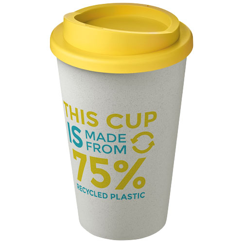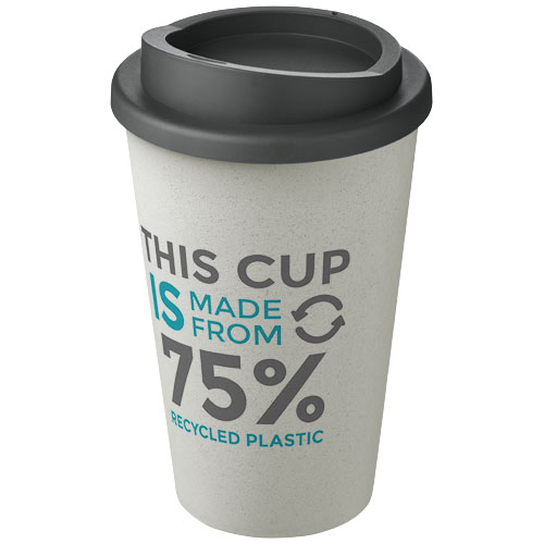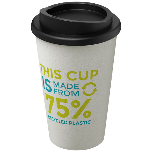 Doppelwandiger Isolierbecher aus recyceltem Kunststoff mit drehbarem Deckel. Der komplette Becher inkl. Deckel besteht zu 75% aus recyceltem Material: ein recycelter Becher mit schwarzer Innenwand und ein Standarddeckel. Aufgrund der Beschaffenheit von recyceltem Kunststoff kann es zu kleinen farblichen Nuancen und Farbabweichungen kommen. Das Fassungsvermögen beträgt 350 ml und der Becher ist vollständig recycelbar. Hergestellt in UK. Verpackt in einem recycelten PE-Kunststoffbeutel. BPA-frei.