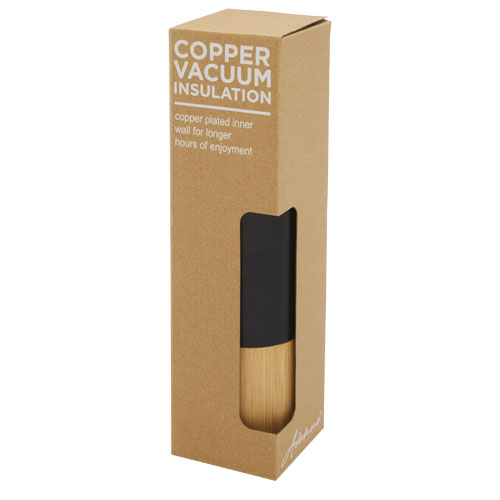 Kupfer vakuumisolierte 18/8 Edelstahlflasche, die Getränke mehrere Stunden heiß oder kalt hält. Verfügt über ein trendiges Bambus Detail und lässt sich mit dem Griff an der Oberseite des Deckels leicht transportieren. Die Flasche hat eine weite Öffnung, die das Befüllen und Reinigen erleichtert. Geprüft und zugelassen nach deutschem Lebensmittelsicherheitsgesetz (LFGB) und auf Phthalatgehalt gemäß REACH Verordnung getestet. Fassungsvermögen 540 ml. Verpackt in einer Geschenkbox aus Recyclingkarton.